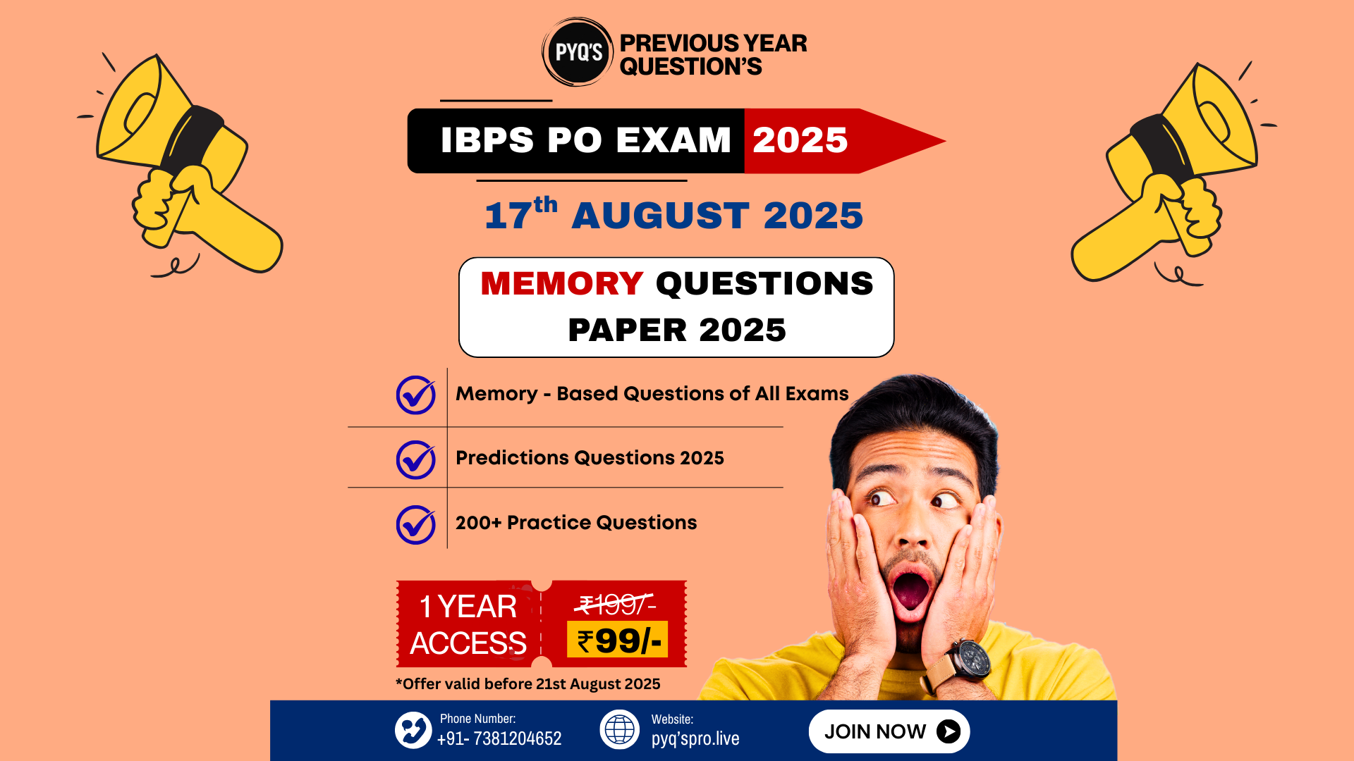 PYQ’s Pro is a digital platform where you can access memory-based Previous Year Questions (PYQs), prediction sets, practice sets, and exam trend analysis for top exams like IBPS, SBI, JEE, NEET, and more.
